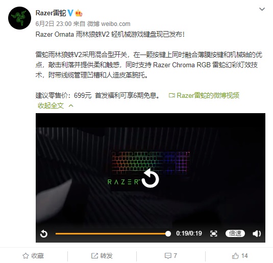 编后语:关于《雷蛇发布雨林狼蛛V2轻机械游戏键盘,售价699元》关于知识就介绍到这里,希望本站内容能让您有所收获,如有疑问可跟帖留言,值班小编第一时间回复。 下一篇内容是有关《CF6月王者夺宝活动地址2020CF王者夺宝6月活动入口》,感兴趣的同学可以点击进去看看。
