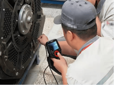 如下图,是中国中车采用古安泰工业内窥镜C40系列对电机内部的异物,如螺丝进行检测的场景图片。这款产品具有360°转向功能,能够全方位观测电机内部,图像清晰,实时检测图像可多倍放大,用户可有效掌握内部情况。可以采用带齿异物钳工业内窥镜,则可以更迅速有效地解决异物滞留的问题。