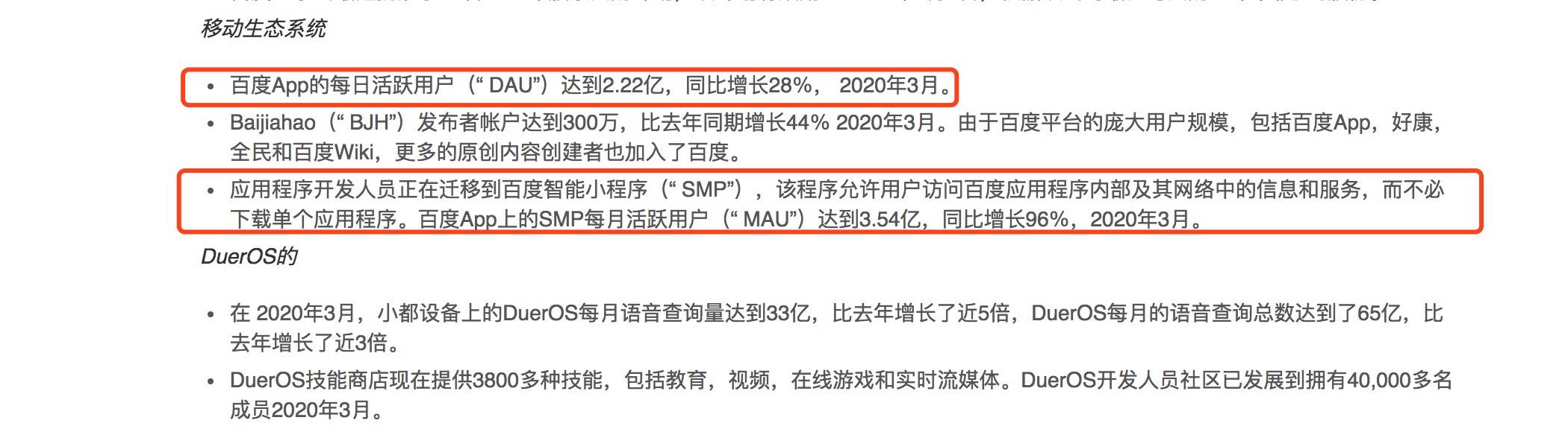 而百度在移动生态领域的小程序建设,也初见成效。财报显示,2020年第一季度,百度App日活跃用户(DAU)数达2.22亿,同比增长28%,App端内搜索量同比增长45%。其中百度App上的SMP(百度智能小程序)每月活跃用户(MAU)达到3.54亿,同比增长96%。