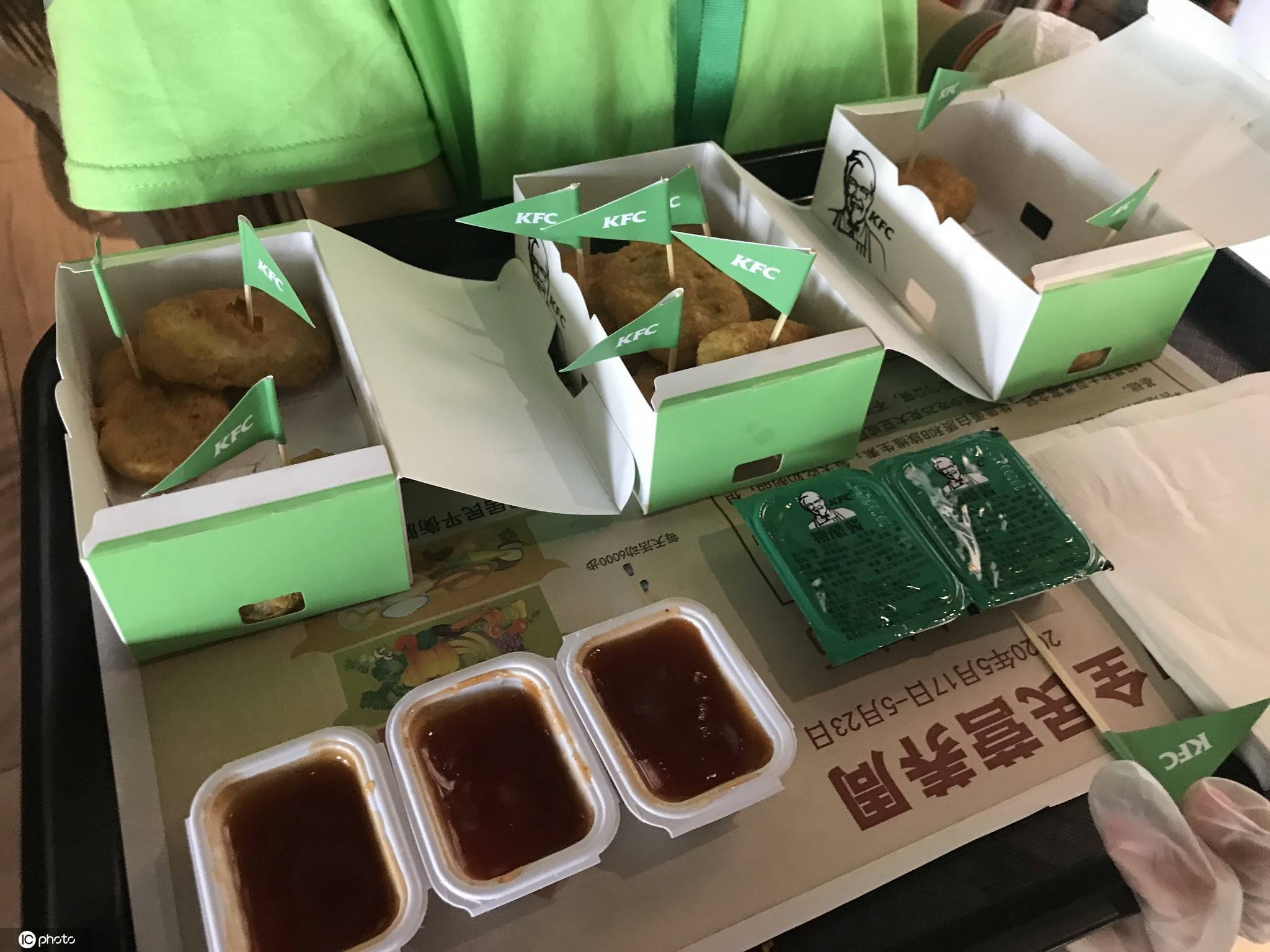 2020年6月3日,北京,北京肯德基宣武门餐厅。本周百胜中国宣布与植物蛋白产品公司Beyond Meat(别样肉客)达成合作协议,将于6月3日起限时在旗下肯德基、必胜客等中国部分地区门店推出新品——别样汉堡。6月3日起,肯德基将在北京、成都、杭州和上海的分店推出植培牛肉芝士汉堡和植培黄金鸡块,限时3天。其中植培牛肉芝士汉堡定价32元,植培黄金鸡块2元/5块。杜雪/IC photo