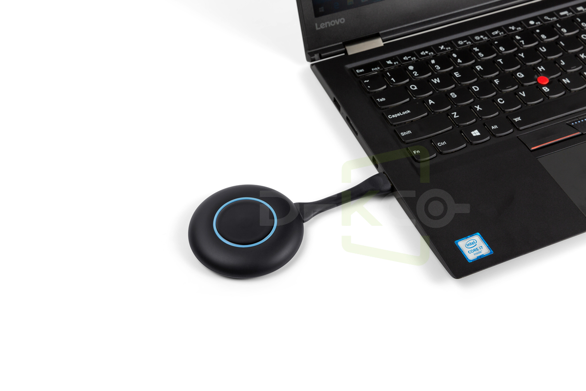 上面的实操视频中,大家可以看到,笔记本电脑在会议室无线投屏的过程中,笔记本电脑与电视之间并没有连接信号线,而是在笔记本的USB接口插入了一支圆形状的按键,我们叫“USB投屏按键:使用起来非常简单,不需要做任何设置,不需要安装任何软件,也不需要连网,只需简单三步即可完成无线投屏展示。