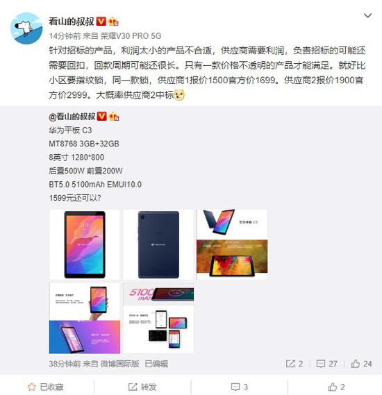 为何定价 1599 元左右?该博主还表示,针对招标的产品,利润太小的产品不合适,供应商需要利润,负责招标的可能还需要回扣,回款周期可能还很长。只有一款价格不透明的产品才能满足。