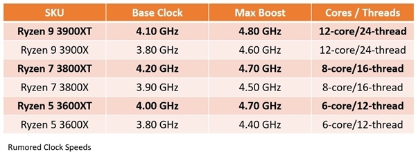 锐龙3000XT系列产品是锐龙3000的改良版,架构、工艺应该没有什么变化,主要就是提升频率,之前泄露的信息如下:
