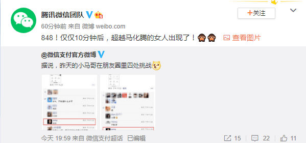 很快,@腾讯微信团队 更新微博:“848!仅仅10分钟后,超越马化腾的女人出现了!”