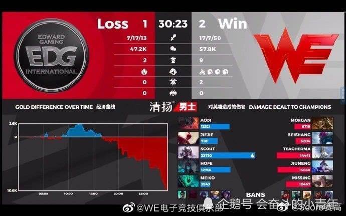 连续四个赛季都是0-2输掉揭幕战的WE终于成功打碎了这个魔咒,同时,这也是连续第四个赛季在常规赛阶段WE取得对EDG战队的胜利。
