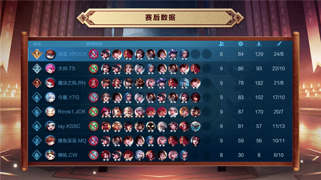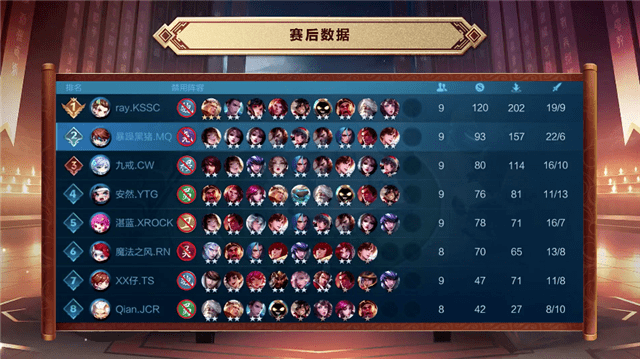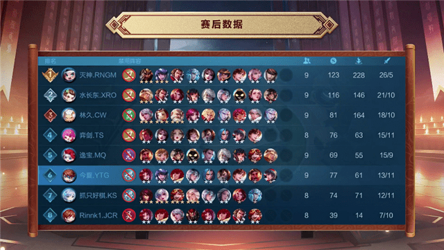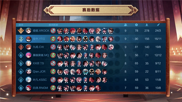 第7回合,MQ.逸宝遭遇CW.噢吼蜀国阵容连胜被终结。第11回合,CW.噢吼拿下7连胜。第13回合,KSSC.抓只好棋10连败。第16回合,KSSC.抓只好棋血入TS.弈剑。第18回合,JCR.Ze1被击败血量下至8。第19回合,YTG.曹老大以第八名被淘汰。第21回合,MQ.逸宝以第七名被淘汰。第22回合,JCR.Ze1以第六名被淘汰。第23回合,CW.噢吼以第五名被淘汰。第26回合,TS.弈剑搜出两星武则天,RNGM.灭神以第四名被淘汰。第29回合,TS.弈剑以第三名被淘汰,XROCK.水长东触发绝地反击。第31回合,KSSC.抓只好棋攻辅长城神坦阵容龟甲阵坚不可摧!三星后羿位置绝佳疯狂输出,战胜XROCK.水长东扶桑法刺成功登顶!