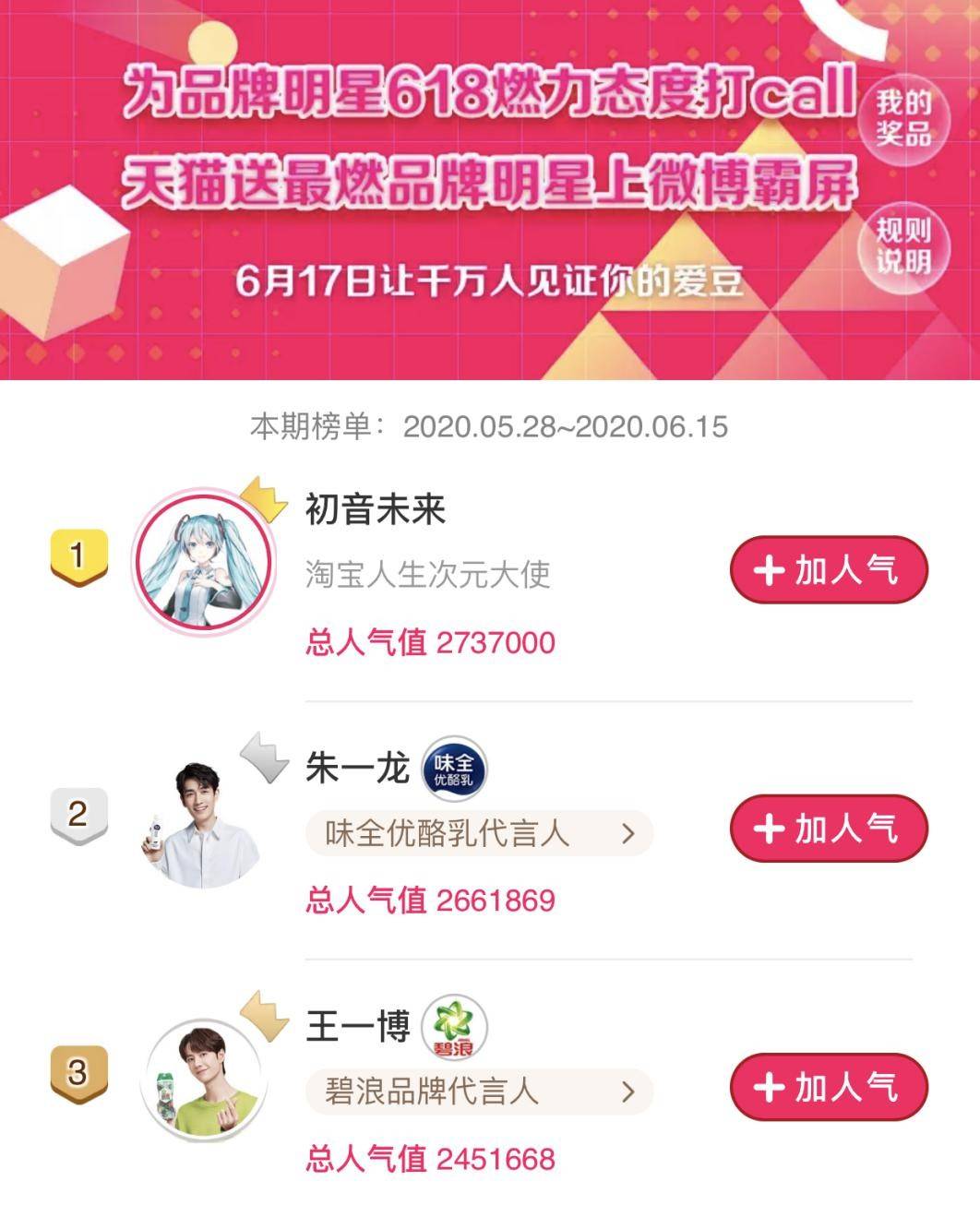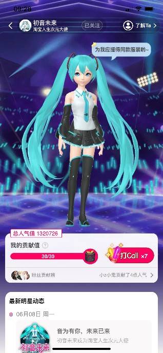 各位二次元粉丝注意!虚拟偶像“初音未来”来淘宝了!半天不到,“初音未来”人气连超王一博、朱一龙,登顶天猫618明星榜!粉丝的热情一度挤爆页面。