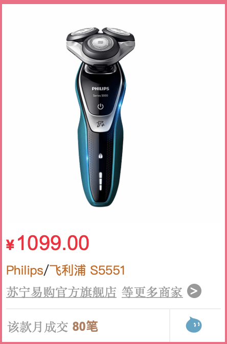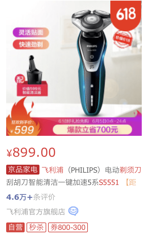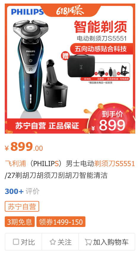 再看看这个飞利浦剃须刀同款对比,京东到手价599元,苏宁到手价899元。这里想吐槽一句,搞活动写个原价,再写个折后到手价,结果两个价值一毛一样,这操作为什么呢?总不能是为了锻炼设计师的改图能力吧?