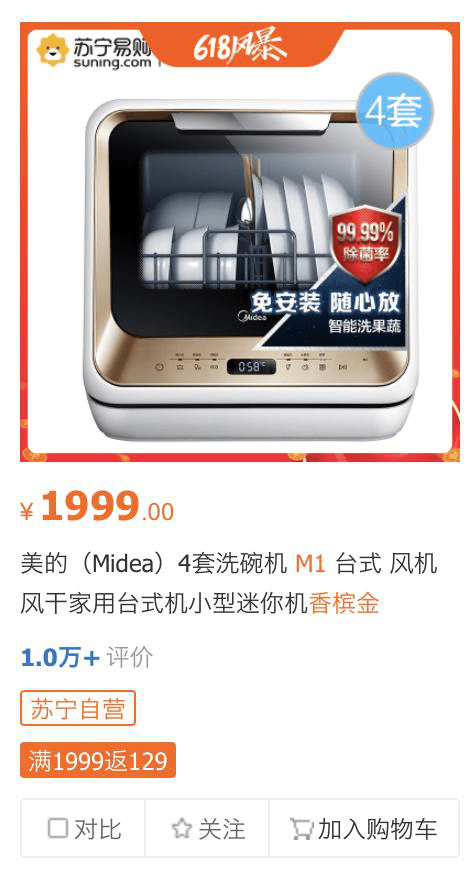 单看6月5日这一天的商品。同款美的洗碗机苏宁价1999,京东购物车内价格1199,领券后价格只需999。价格差高达1000元,苏宁价格整整比京东价格贵了一倍!