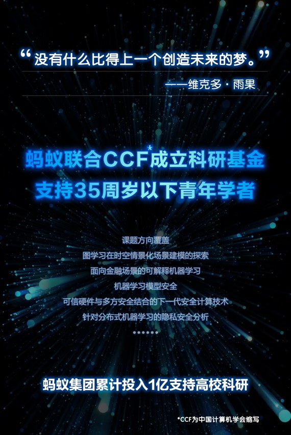 据悉,这一基金将面向人工智能、区块链、安全等领域的29个细分前沿科技领域,如图学习在时空场景化场景建模的探索、机器学习模型安全等,支持35周岁以下青年学者的相关科研。