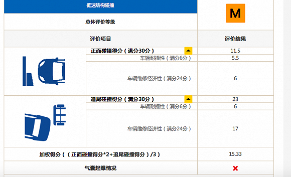 具体而言,在耐撞性及维修经济性指数方面,15km/h的正面碰撞得分为11.5分,其中耐撞性得分为5.5分(满分6分),维修经济性得分为6分(满分24分),正碰维修比为11.50%;15km/h的追尾碰撞得分为23分,其中耐撞性得分为6分(满分6分),维修经济性得分为17分(满分24分),尾碰维修比为2.04%。最终的加权得分为15.33分(满分30分),特斯拉Model3车型获得一般(M)评价。