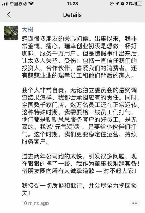 “过去两年公司跑得太快,引发很多问题,现在狠狠的摔了一跤,我作为董事长难辞其咎!借朋友圈向所有人诚挚道歉——对不起大家!”他说。