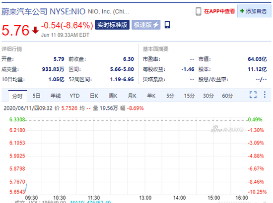 6月11日晚间消息,蔚来开盘跌9%,截止发稿跌8.64%,报5.76美元,市值64.03亿美元。