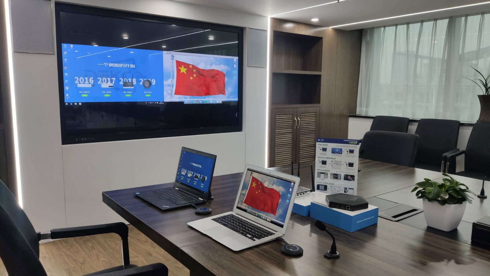 会议室采用德恪USB一键无线投屏分享系统结合液晶拼接屏实际应用展示: