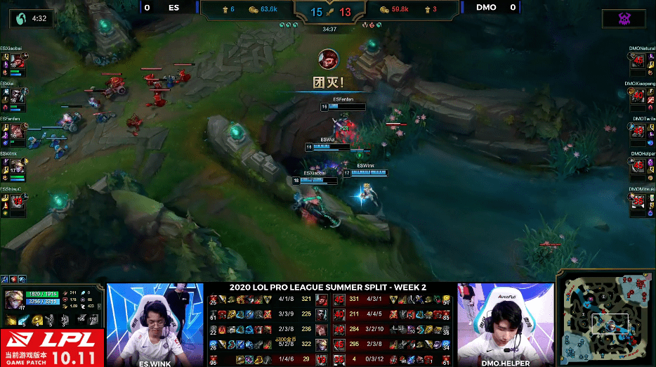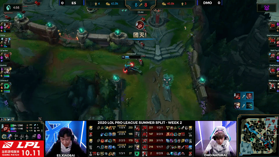 三十四分钟,水龙龙魂ES必须抢!DMO贾克斯首先是去买了自己一波,逼出了ES队员的技能,本来是DMO很完美的团战,结果猴子一个定海神针加上腕豪的控制打出完美AOE,加上EZ疯狂输出,直接团灭DMO!
