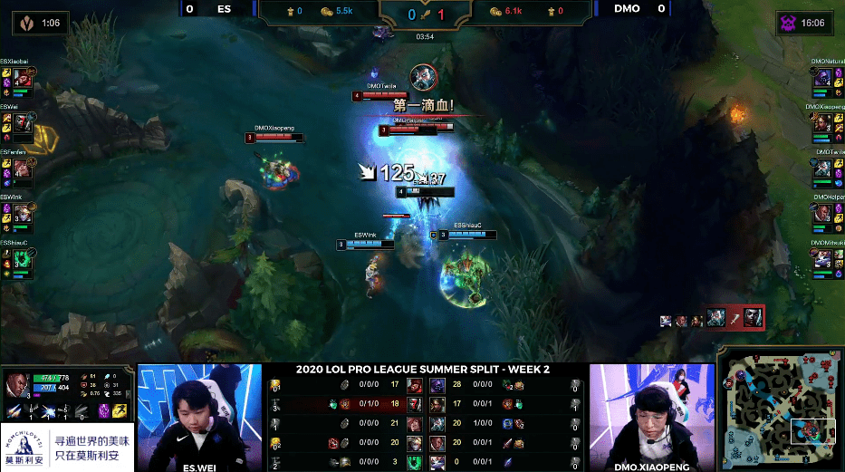 三分钟时,为了小龙河蟹的争夺全,ES和DMO是四打四的局面。但是艾克三级和豹女三级不是一个等级的伤害,而且中单腕豪没有很大的状态,时光拿到艾克的一血之后。DMO继续追击,击杀了ES的腕豪和锤石,而且ES的队员双招都交地差不多了,零换三,ES血亏。