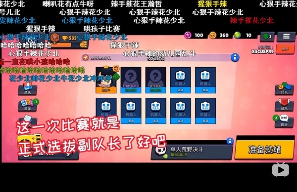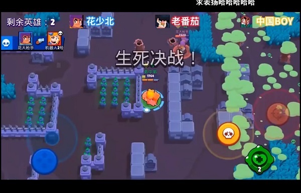 荒野决斗中这个模式有些类似于时下流行“吃鸡”游戏的玩法,游戏中有一个毒圈,随着毒圈不断缩小,在战局中最后存活下来的才能成为赢家。这次老番茄选择的角色是近战英雄罗莎,花少北选择的英雄是射手雪莉,中国boy选择的是射手柯尔特。