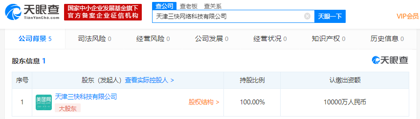 据天眼查数据显示,6月11日,天津三快网络科技有限公司成立,该公司注册资本1亿人民币,法定代表人为樊蕾,公司经营范围包括技术服务、技术开发、技术咨询、技术交流、技术转让、技术推广;计算机软硬件及辅助设备批发;计算机软硬件及辅助设备零售;计算机系统服务;信息系统集成服务等,由天津三快科技有限公司全资控股,后者为美团的关联公司北京三快科技有限公司的全资子公司。