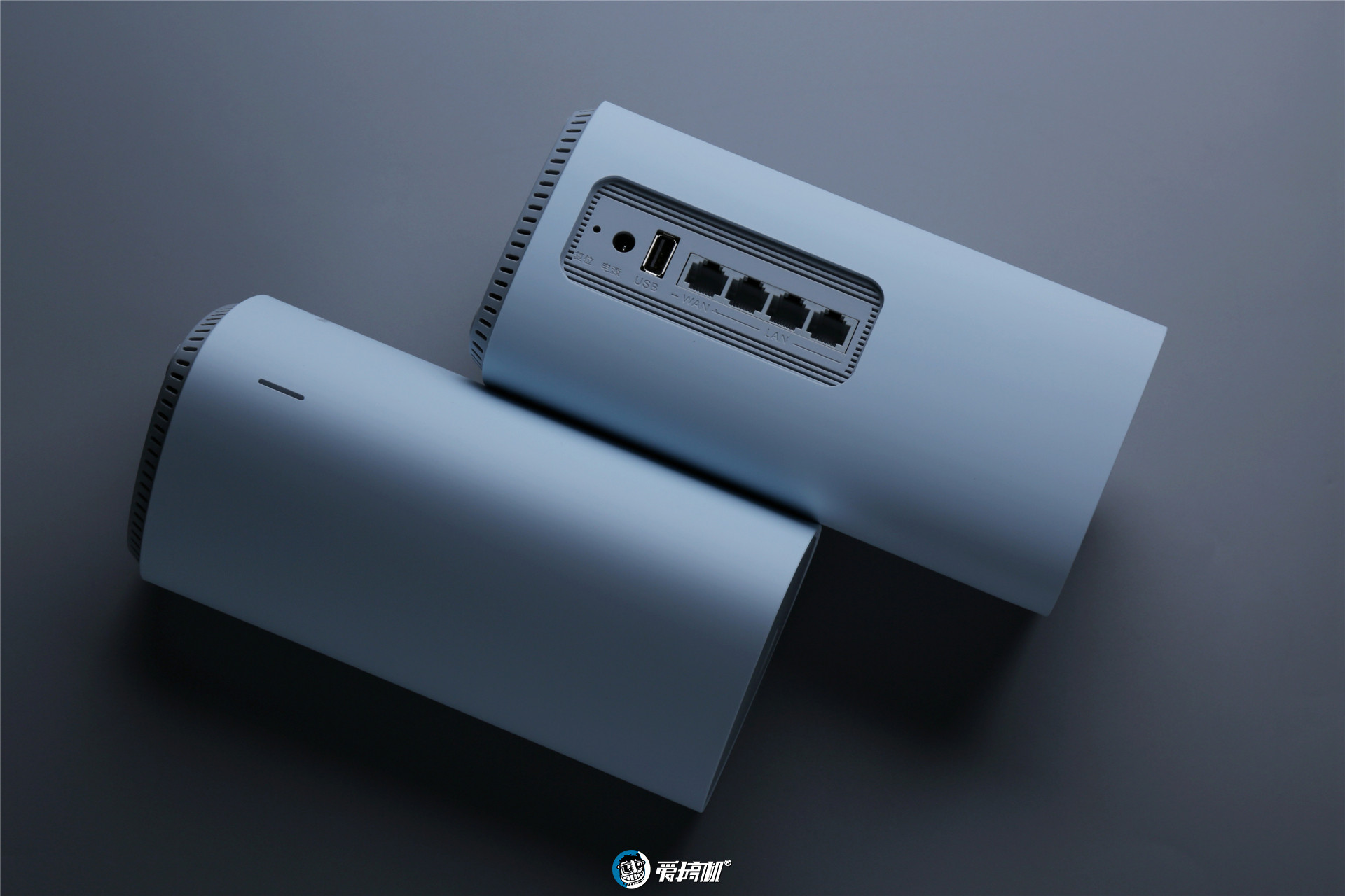 和前代很接近的包装和外观设计,非常特殊的三角圆筒设计。这个配色又像浅绿,又像暗绿,做出了“五彩斑斓的黑”效果。另外,这也是第一次在路由器上遇到类肤涂层。手感和外观都挺有格调的,比起前代多了一个 LAN 口和 USB 接口,拓展性有了。