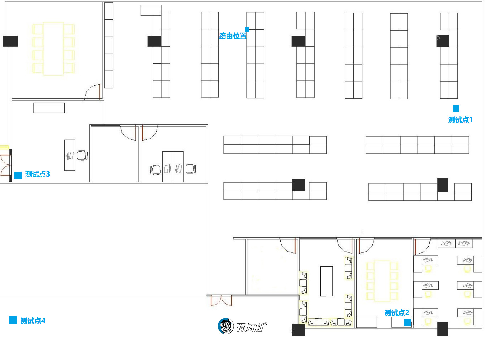 测试地点是 300 平左右的搞机办公室,两个路由并排放置,路由距离测试点 1 已经有 10 米距离,信号最差的测试点 4 则是隔了个电梯,中间有 N 道承重墙。