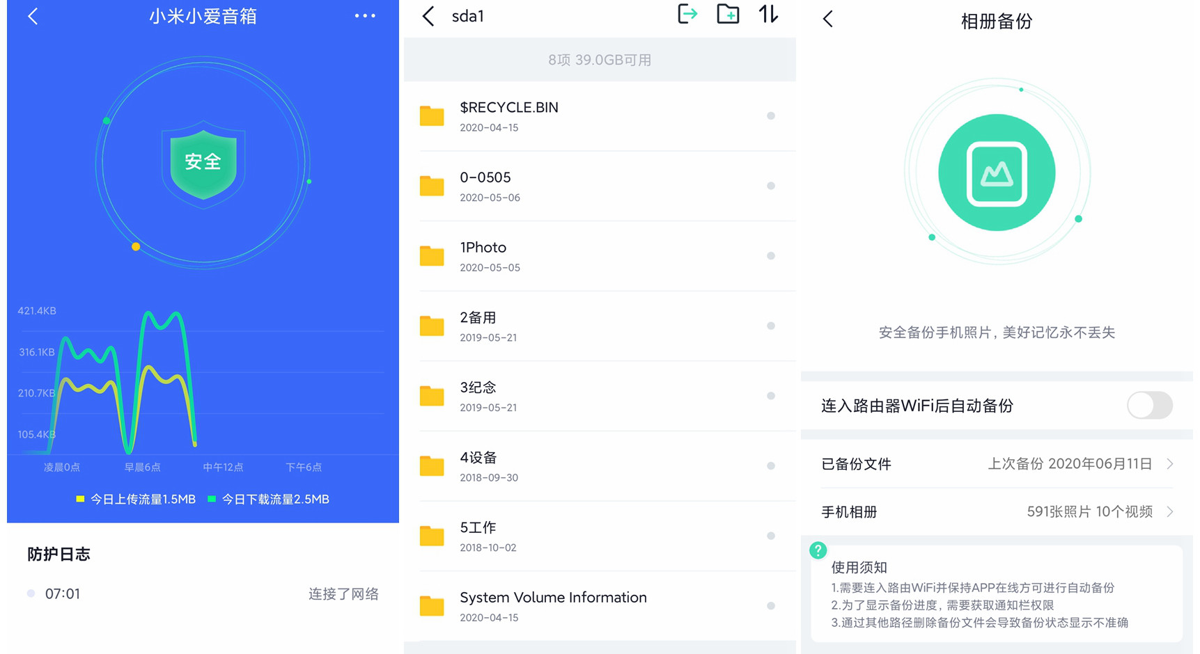 360WiFi6全屋路由有 USB 接口,实测 U 盘、移动硬盘和读卡器都可以直接读取。app 小程序里有个相册备份,内网可以自动备份照片到 USB 设备上。这个功能吼啊,同样是全自动不用管。