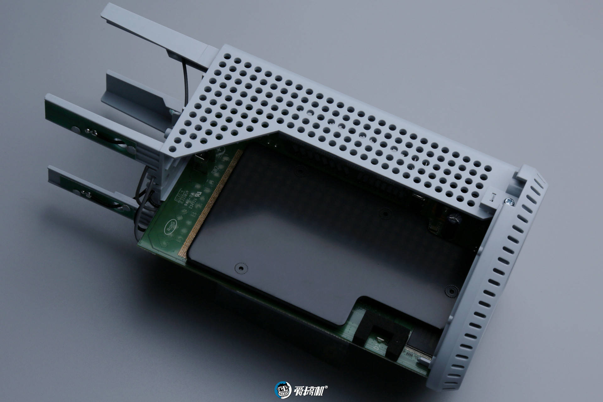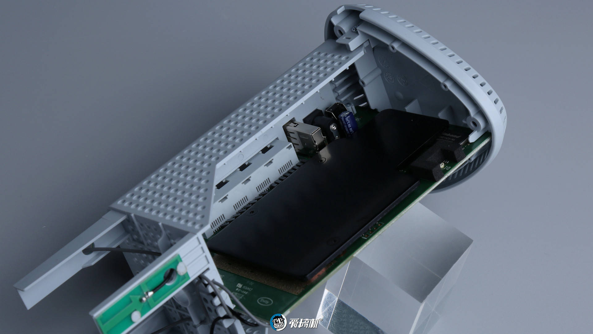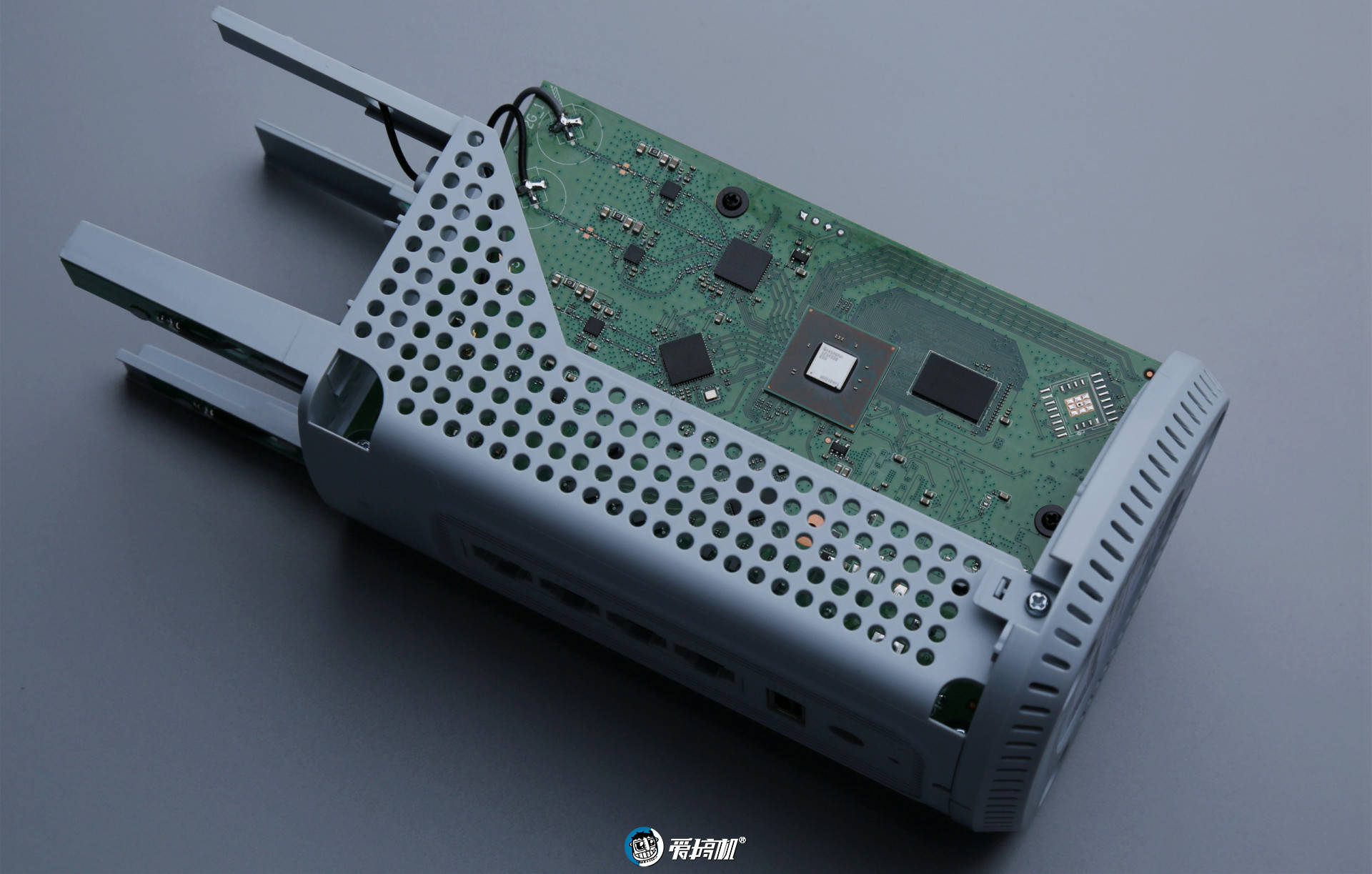 顶上是 4 根隐藏式的天线,而主板另外一边,居然一整面都是散热板,用料很凶。