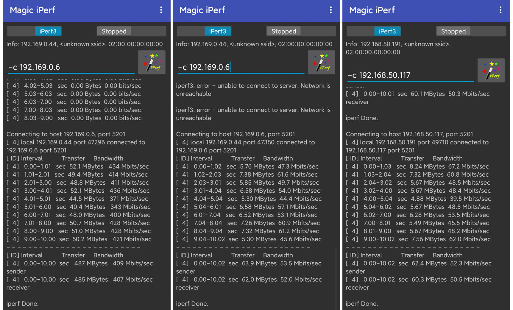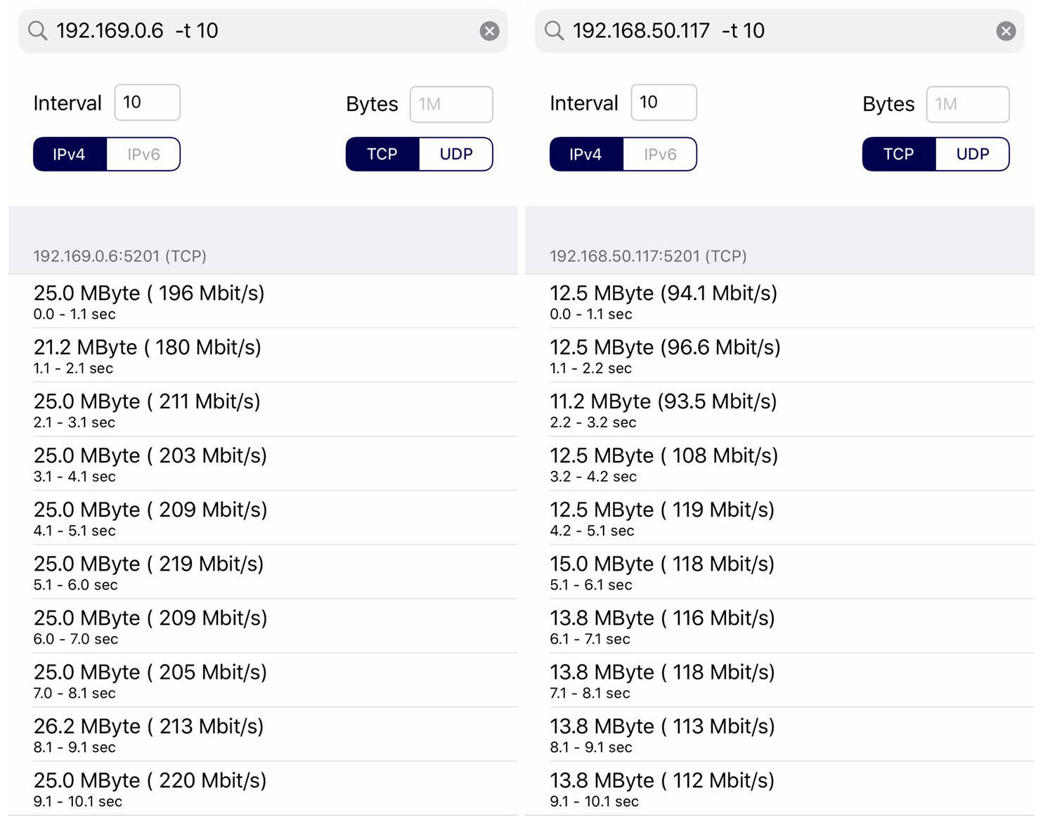 用 PC 直连路由,做 iPerf 服务器,手机分别连接两台路由器进行默认测试。WiFi 6 的带宽优势简直碾压,完全不在一条起跑线。WiFi 5 被秒了足足 8 倍有余,甚至连 WiFi 6 的 2.4G WiFi 都打不赢。如果加到 10 线程 1M,都可以跑到 700Mbps了,单单看着状态栏显示每秒 70M 的速度就已经是一种享受了。