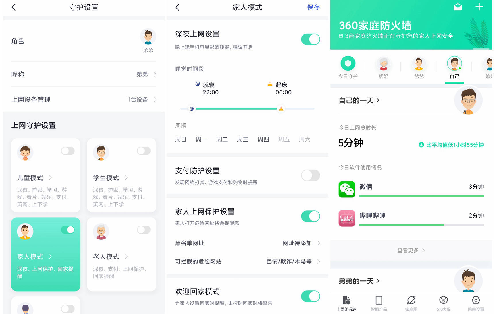 除了常见的网络查看和防蹭网之外,360家庭防火墙App有市面上最强大的上网用户管理功能。儿童守护、老人守护强到没谱,简直就是跨平台通用的“屏幕时间管理app”,app使用类型、时长都有,断网限速之类的自然不在话下。