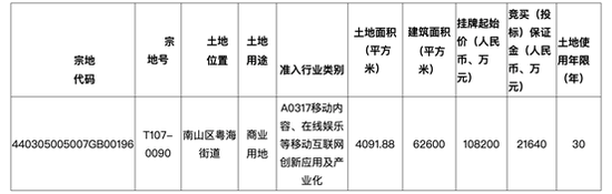 投资界在“深圳市土地房产交易中心”搜索该标的发现,这宗商业用地土地面积4091.88平方米,建筑面积为62600平方米,以10.82亿的价格挂牌,最终也成交于这个价格。这块商业用地的准入行业类别为A0317移动内容、在线娱乐等移动互联网创新应用及产业化,土地使用权年限为30年。