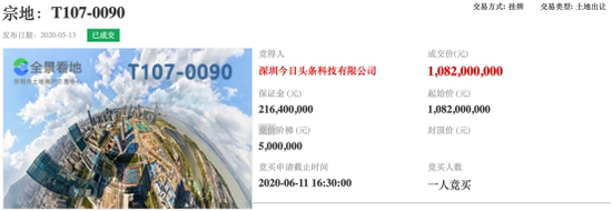投资界获悉,6月11日,深圳今日头条有限公司以底价10.82亿元,竞得深圳南山区后海总部基地一宗商业用地,标的代号为T107-0090。