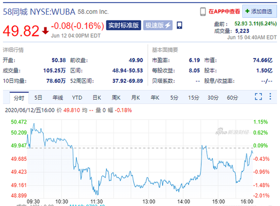6月15日下午消息,58同城盘前涨超6%,报52.93美元。