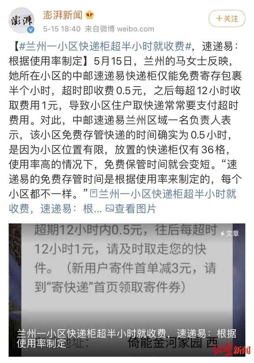 据媒体公开报道,今年5月,家住兰州的马女士就反映,她所在小区的中邮速递易快递柜仅能免费寄存包裹半个小时,超时即收费0.5元,之后每超12小时收取费用1元,导致小区住户取快递,常常要支付超时费用。对此,当地一名负责人表示,由于小区位置有限,使用率高的情况下,免费保管时间就会变短。