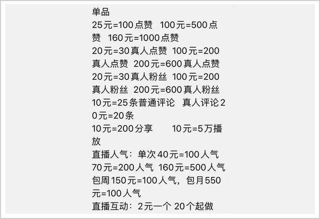 网络上,很多商家表示可以提供点赞、播放、评论、分享等视频和直播相关的数据服务,且价格低廉。其中一家的报价显示,花10元就能买到某直播平台5万的播放量。