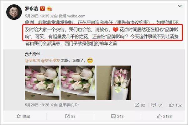收到烂花的买家在微博上连番轰炸,向老罗和品牌讨说法。所幸老罗反应还算及时,第一时间公开道歉,并站出来怒斥品牌商。
