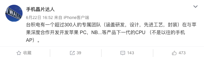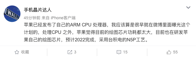 另外,据供应链@手机晶片达人在微博上表示消息称,台积电有一个超过300人的专属团队(涵盖研发,设计,先进工艺,封装)在与苹果深度合作开发开发苹果 PC,NB...等产品下一代的CPU。与此同时,@手机晶片达人还爆料称,苹果觉得目前的绘图芯片功耗都太大,因此也在研发自己的绘图芯片,预计2022完成,采用台积电的N5P工艺。