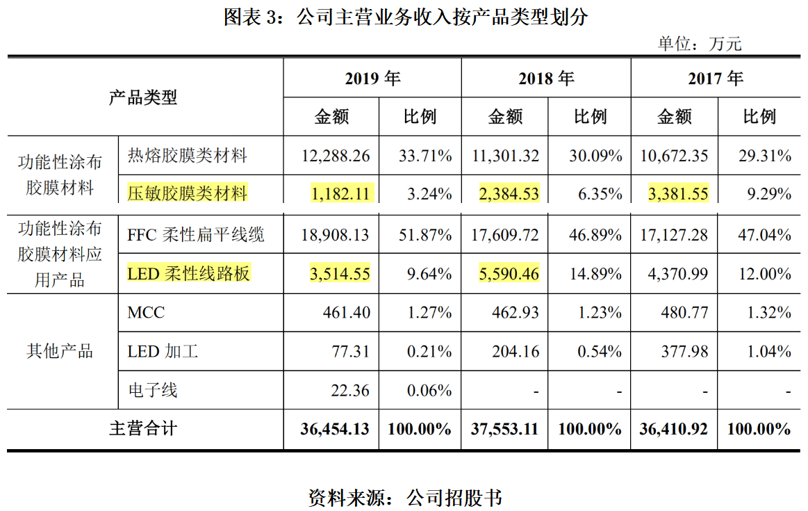莱尔科技的主营产品以热熔胶膜类材料、压敏胶膜类材料、FFC 柔性扁平线缆、LED 柔性线路板为主。其中,压敏胶膜类材料和LED柔性线路板两大产品的营收合计占比接近20%,是总营收下滑的主因。报告期内,压敏胶膜类材料的收入由2017年的3381.55万元下滑至2019年的1182.11万元,LED柔性线路板的收入由2017年的4370.99万元下滑至2019年的3514.55万元。