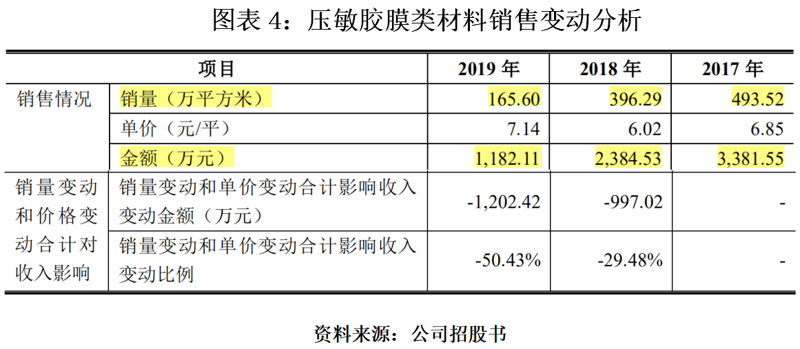 其中,压敏胶膜类材料的销售收入呈逐年递减趋势,2017年、2018年和2019年分别为3381.55万元、2384.53万元和1182.11万元,2018年、2019年分别同比下降29.48%、50.43%。