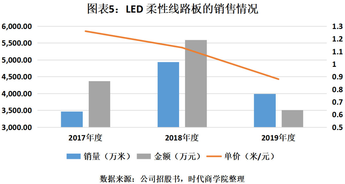 但参与激烈的价格战并未能很好地达成销量增长与抢夺份额的目标。2019年LED柔性线路板的销售数量并未能延续2018年的增长,反减946.35万米。2019年的销售额较2018 年减少2075.91万元,同比下降37.13%。