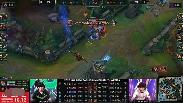 比赛来22分钟,双方在中路发生5V5团战(双方在中路纠缠,泰坦勾到女坦,复仇之矛大招收回女坦,奥恩大招撞飞复仇之矛,虽然复仇之矛被VG集火击杀,但是豹女输出无人限制),最终V5 1换3VG,赢下这波团战胜利!随后厄斐琉斯在V5红区F6处击杀掉V5中辅(V5中辅追杀残血厄斐琉斯,被厄斐琉斯闪现拉开身位极限拉扯1V2双杀),而豹女拿下己方第四条小龙(V5获得土龙魂)。