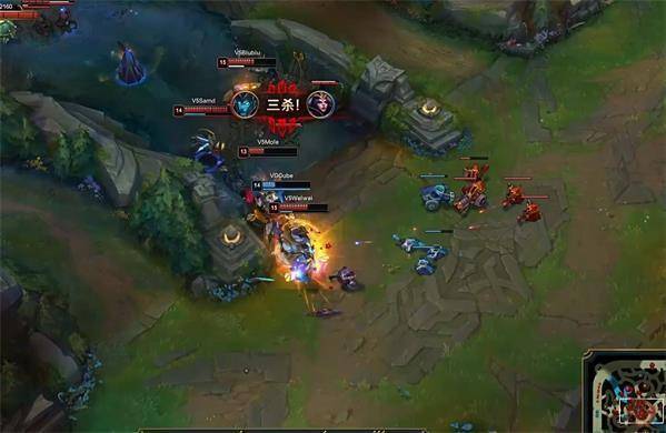 12分钟,V5三人在中路旁集火击杀掉落单的奥拉夫。