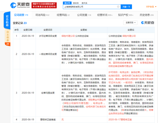 6月3日下午消息,天眼查数据显示,近日,上海携程商务有限公司发生工商变更,经营范围新增食品经营。此外,一般经营项目新增国内航线、国际航线或者香港、澳门、台湾地区航线的航空客运销售代理业务。