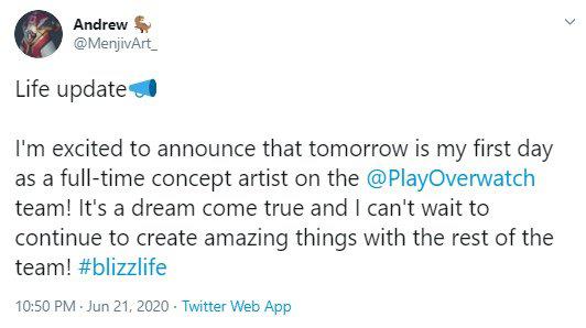 设计师Andrew Menhivar两年前为守望先锋设计了潜艇基地概念设计,一年前参与了暴雪“巴黎”地图部分设计,今天正式入职暴雪“守望先锋”团队。