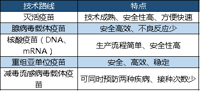 新冠疫苗主要有5种技术路线,分别为灭活疫苗、腺病毒载体疫苗、核酸疫苗(DNA、mRNA)、重组亚单位疫苗、减毒流感病毒载体疫苗。5种技术路线各有特点: