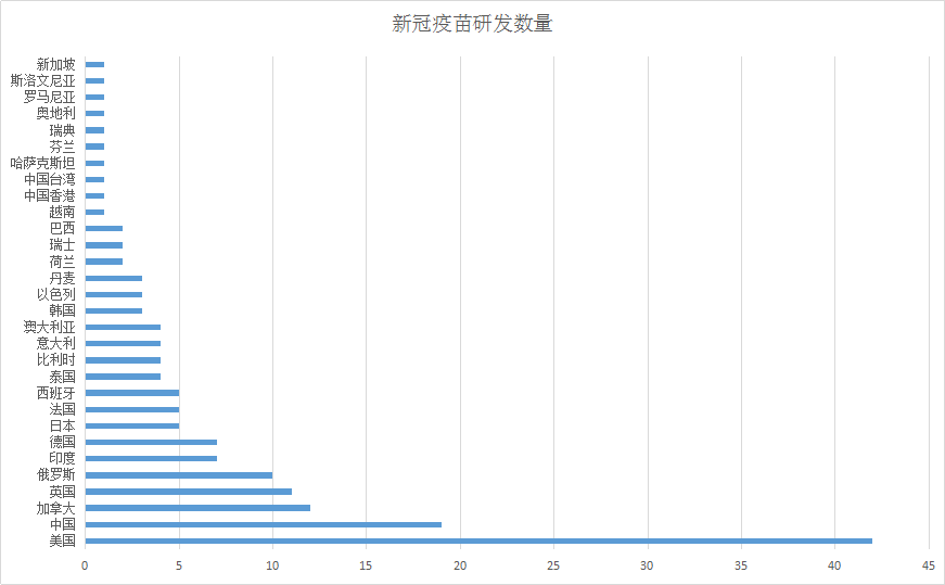 根据世卫组织公布的最新数据,目前全球共有133种新冠病毒疫苗在研,其中美国以42种高居榜首,其次是中国19种,加拿大12种,英国11种,俄罗斯10种。