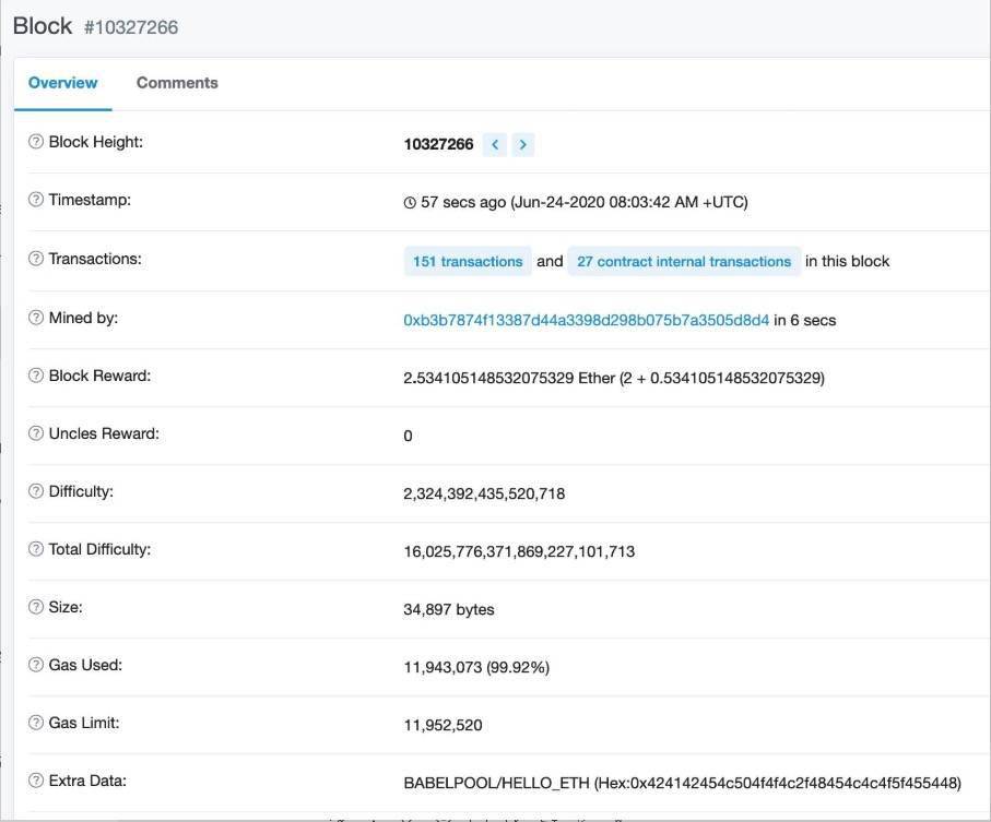 贝宝金融旗下以太坊矿池正式上线,并于北京时间2020年6月24日16时3分在区块高度10327266正式挖出第一个以太坊区块,区块上留言为“BABELPOOL/HELLO_ETH”。