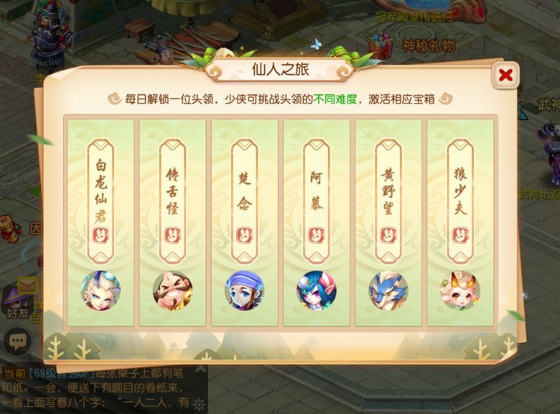 端午佳节,天庭中的仙人也纷纷下凡,与三界少侠同乐。在活动期间,等级≥40级的少侠可以3人或3人以上组队,前去挑战仙人。根据活动开放时间,游戏将每天解锁一位仙人供玩家挑战。而每位仙人则有普通、困难、地狱三种难度,供不同实力的玩家选择。