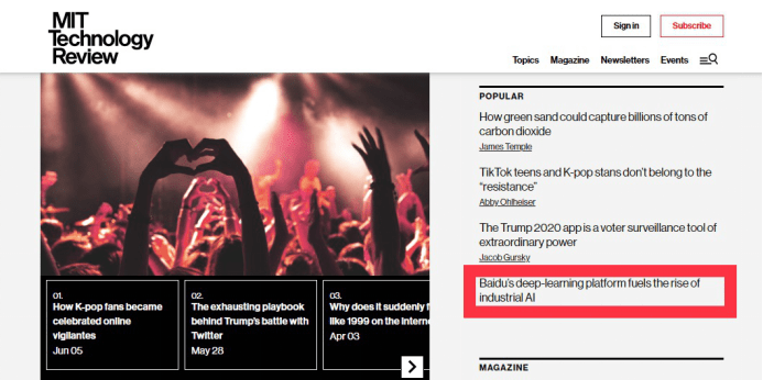 在美国大选年、平权运动的热闹声里,一篇讲述大洋彼岸的中国AI故事意外登上了热读榜单。这篇文章来自全球顶级科技商业杂志、美国麻省理工学院主办的《MIT科技评论》,那些基于百度飞桨,以AI重塑林业,能源、垃圾管理的真实故事收获了一筐好评,MIT科技评论称,“百度飞桨深度学习平台,正在推动工业人工智能崛起。”