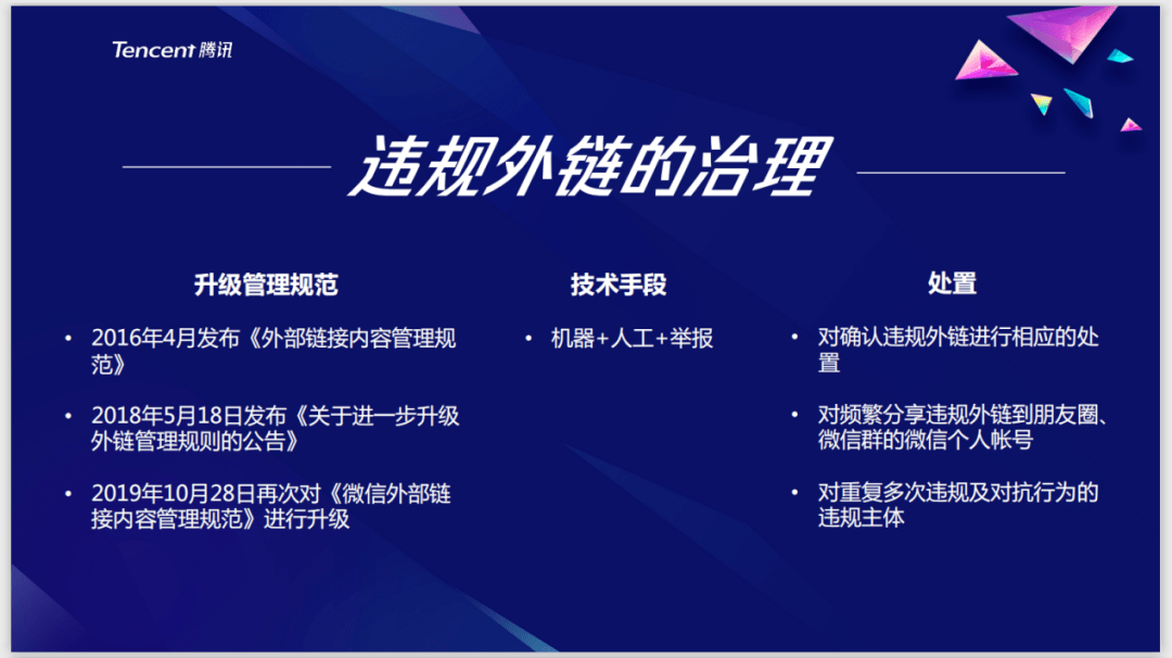 “我们的愿景就是希望微信朋友圈和微信聊天都是分享生活点滴的场所,但是一些黑灰产的场所就是利用外部链接大做文章,诱导强制用户分享传播,这些违规外链中往往大概率会包含一些垃圾营销、低俗、欺诈等恶意的内容,严重破坏了我们正常用户的正常体验甚至影响平台健康生态。另外,这类大量的违规外链又延伸出一系列的黑灰产产业,例如违规外链为了躲避微信的安全策略和打击需要,需要储备大量的URL,储备大量的网络域名,这不仅仅严重危害微信平台,甚至影响整个互联网的发展顺序和规范。”钟广君表示。