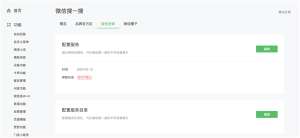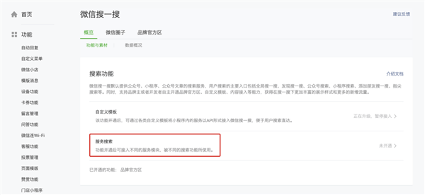 商家登录微信公众平台,在“微信搜一搜”-“搜索功能”中点击“服务搜索”,进入服务搜索页。