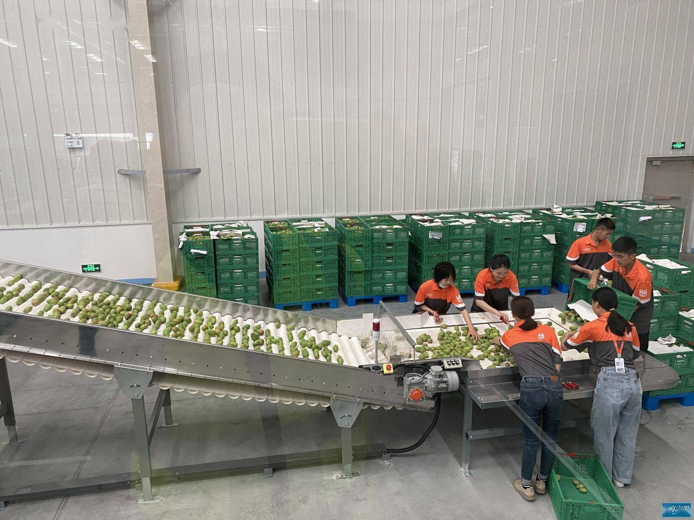 阿里巴巴数字农业广西仓内,多位产业工人正往自动分选线上倾倒水果。